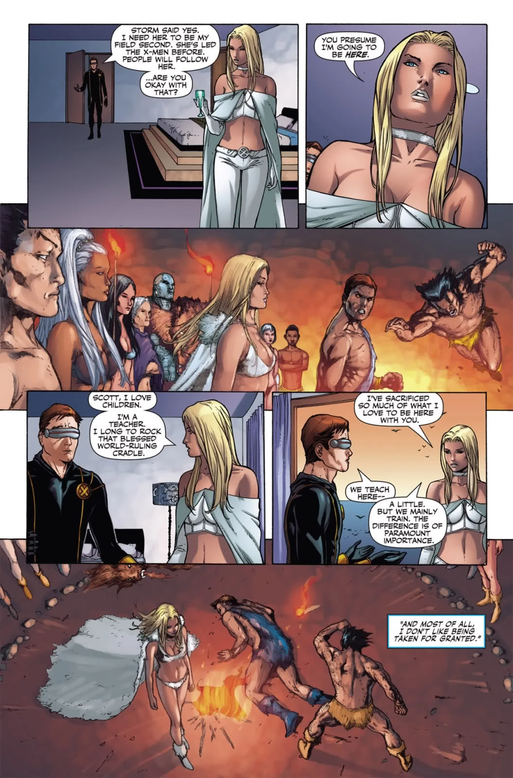 The Red Queen along with her Sisterhood of Mutants attack the X-Men with the goal of retrieving a lock of Jean Grey's hair in Wolverine's possession, with Lady Mastermind placing Emma under a a psychic barricade. A woman resembling Jean Grey appears to Emma and helps her to break free by using what appears to be a bit of the Phoenix Force. She defeats Lady Mastermind and later attacks the Sisterhood at their base along with Storm, Karma and Dazzler. Emma is later awoken in the middle of the night by Beast who states that the secrets she and Scott have been keeping from each other are going to tear everything apart.