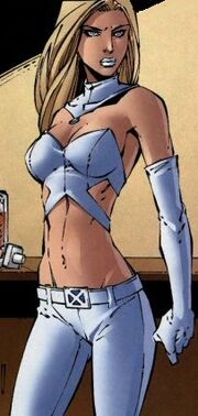 While flying, several Breakworld fighter jets approach, attempting to knock Emma and Scott out of the air. The couple successfully repel the Breakworld onslaught, exchanging heated words in the process. Amidst Emma's protestations that Scott was "acting as though he knew what she's been through," he finally professed his true love for Emma. Stunned, Emma could barely speak, except to utter an apology. Before her reasons behind apologizing were discussed, Scott noticed a blip on their radar. Danger appeared, utterly destroying the S.W.O.R.D. cruiser. Switching to diamond form in the nick of time, Emma is spared while Scott is mortally injured. Cradling an injured Scott in her arms, Emma sheds a tear. As the Danger Room entity approached, Emma makes a request of the machine. She asks that Danger kill her, and that 'she' do so quickly. However, this turns out to be another one of Emma's 'lessons' this time aimed at Danger, who in truth seems incapable of killing the X-Men due to her core programming. Emma offers Danger a deal in exchange for her help with the X-Men's mission. As X-Men proceed with their planned attack Breakworld weapon's installation, they are surrounded by Breakworld ships and Scott is forced to take a single battle cruiser to draw attention from the main team, being shot down and apparently dying in the process (with Emma feeling Scott's life flash before his eyes). Scott is resurrected by their enemies, just as Colossus had been. It turns out Cyclops' sacrifice was all part of a master plan by the team undetected by way of Frost's telepathy in order to distract their opponents so the rest of the team can carry out their own duties without as much difficulty. The arc concludes with Kitty trapped in the bullet and the team trying to find various ways to save the Earth and save Kitty. As the bullet heads toward Earth, Emma keeps in telepathic contact with Kitty, trying to reassure her, even offering to psionically sedate her, though Kitty becomes more and more certain that she will not make it out unharmed or alive. As it becomes clear that all other options have run out, Emma states that she never wanted something like this to happen and she and Kitty come to an understanding. Emma calls Kitty "astonishing" before Kitty sacrifices herself, phasing the bullet through Earth. In the aftermath, the X-Men are uncertain of Kitty's fate, believing her to either be dead or at least phased into part of the runaway bullet. Emma is devastated. In a conversation with Iron Man, Frost announces that the Xavier Institute and the X-Men would not support the Superhuman Registration Act and remain neutral, as she fears that the registration of mutants would put them in more danger.
