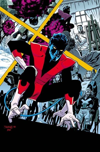 Nightcrawler now resides in Heaven, where he was somewhat of a loner. Despite enjoying paradise, Nightcrawler continued to feel as though he had unfinished business, remaining on the periphery rather than actually joining the heavenly choir. When Azazel mounted an attack on Heaven using his connection to Kurt as a door, the other X-Men were able to create a portal to Heaven via the power of the Bamfs, allowing them to aid Kurt in his fight, and also intending to bring him back from the dead.[1] The plan succeeded, with Azazel defeated thanks to Professor X's own spirit following his death at Cyclops' hand, and Kurt was resurrected by the Bamfs' powers to rejoin the Jean Grey X-Men.[2] Everyone celebrated his return, but was cut short when Mystique came looking for Azazel. Kurt tried to stop both of them, but was defeated.